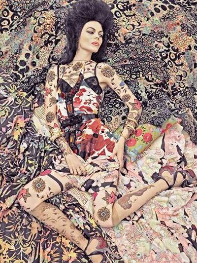 Encore et toujours dans l’inégalable Vogue Italie de décembre, une superbe série photo de Steven Meisel. Un époustouflant jeu de camouflage entre le corps des mannequins, les tenues et les décors, le tout inspiré par les imprimés de l’été 2008. Overdose inhabituelle de couleurs et de motifs à consommer sans modération.