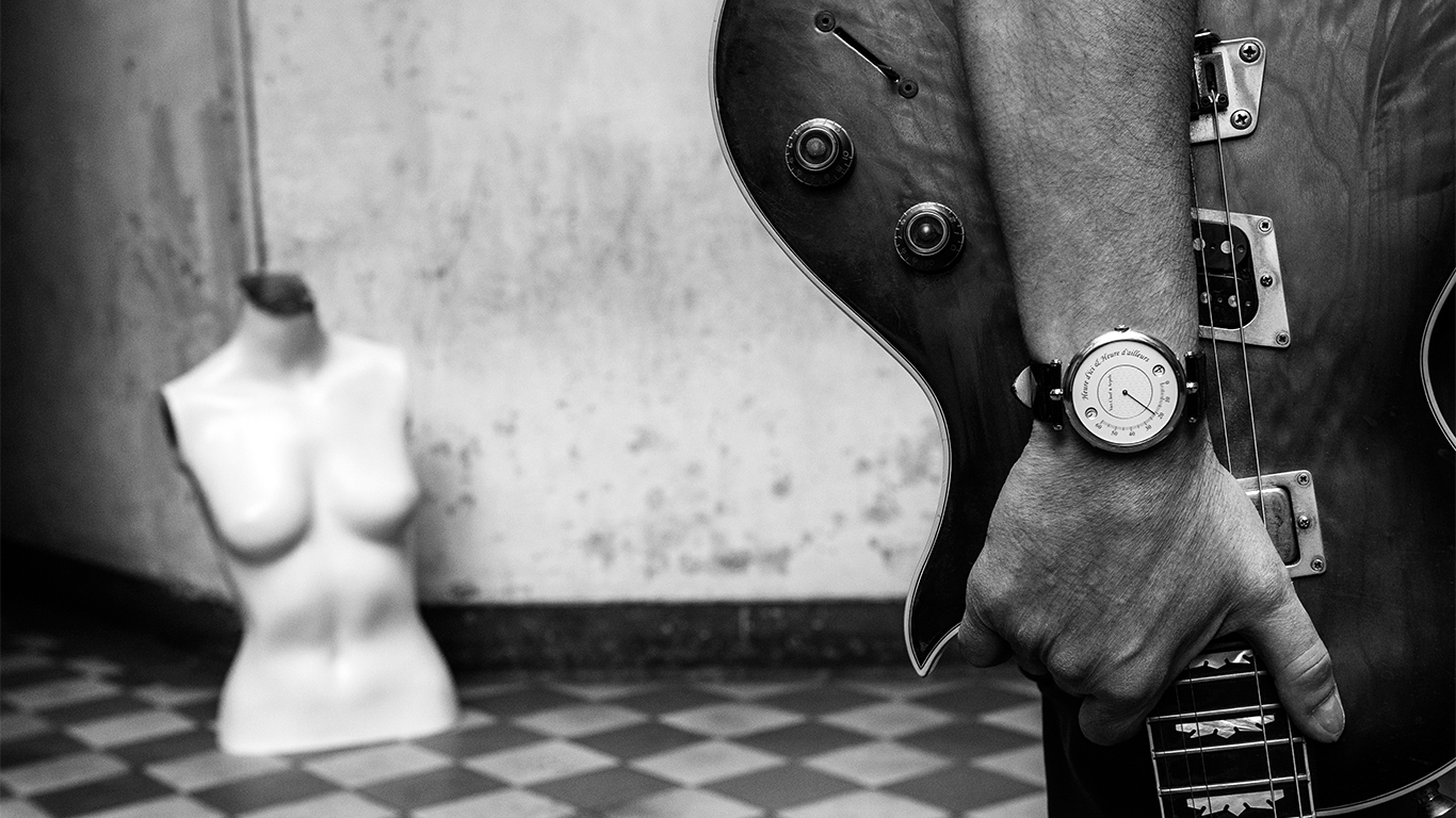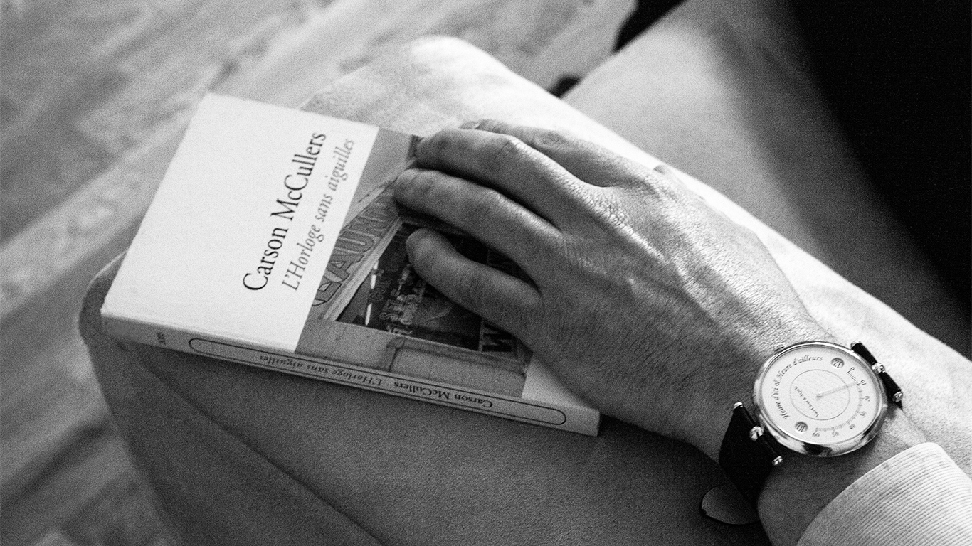 “Heure d’ici et heure d’ailleurs” telle une maxime, un vers, est inscrit sur le cadran. « Ici » est maintenant, « ailleurs » sera demain et vice-versa.