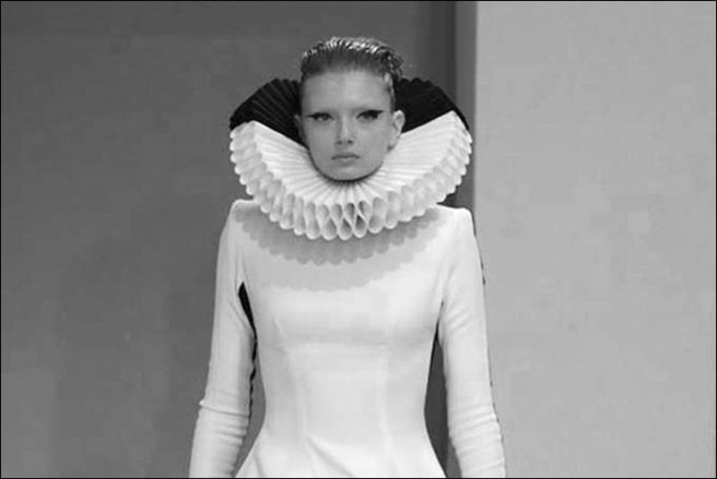 Chez Gareth Pugh et ses créations futuristes en 3D cet élément apporte un caractère précieux et montre un savoir-faire technique, tout en confirmant l’excentricité et l’extravagance de son style.