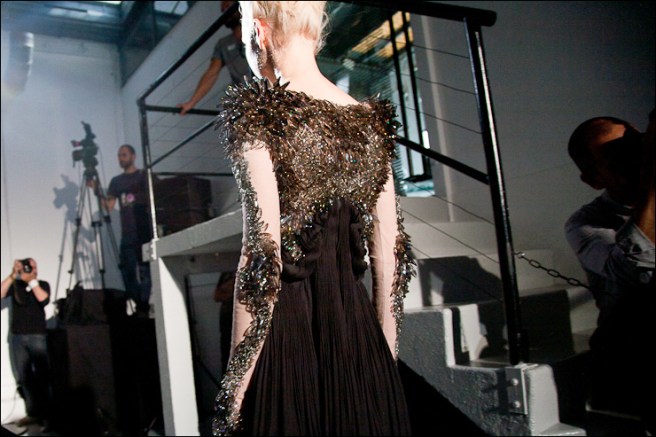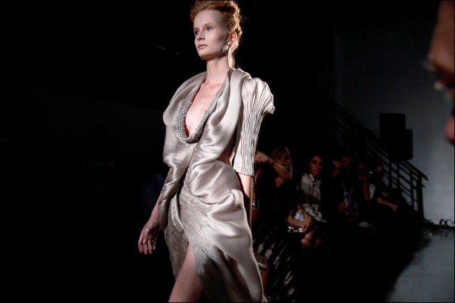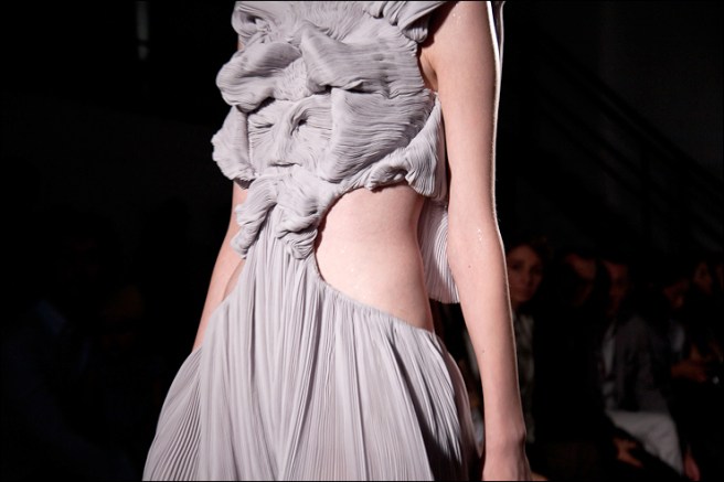 Chez Yiqing Yin, qui avait déjà fait sensation lors du Festival d’Hyères 2010, sans pour autant remporter de prix, la dimension artistique est peut-être moins revendiquée. Cependant on retrouve cette envie quasi-obsessionnelle de travail sur la matière. Bandelettes et lacets chez l’une, plissés très serrés chez l’autre, un travail de sculpture minutieuse.