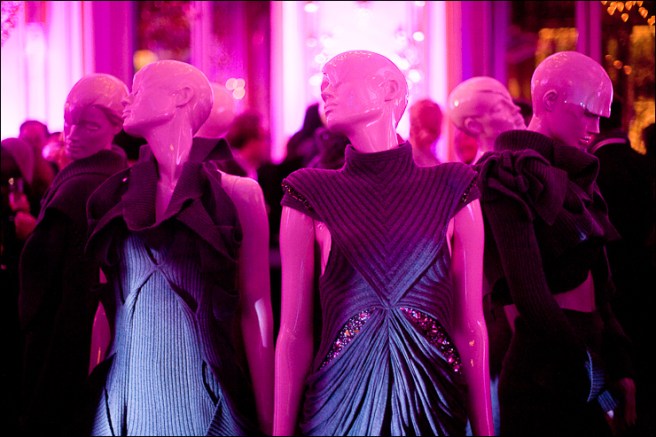Un portant réunissant les créations d’Iris Van Herpen et de Sandra Backlund, autre créatrice, spécialiste de la maille et qui navigue elle aussi à la frontière entre art et mode.