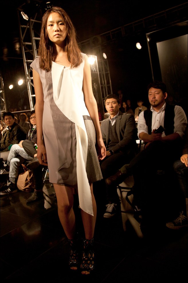 La créatrice est en pleine confiance chez elle, c’est une star et les nombreuses personnalités présentes, dont les fameuses Dal Shabet (groupe de K-Pop) en sont le témoignage. Spectaculaire, le show débute par une performance, réalisé par un danseur survitaminé qui exécute une descente de catwalk avec un déhanché pour le moins… vertigineux.